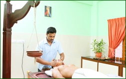 Administration of medicated oil, herbal juice or other medicated formulations to the nostrils after the proper application of medicated oil and fomentation of the face keeping the eyes protected from the heat applying during fomentation. Nasyam helps to evacuate accumulated elements in the nasal sinuses. It stimulates neuro hormonal centres, enhances the function of eyes, nose, ears, induces sound sleep and strengthens the neck and shoulder. It is very effective in the treatment of Sinusitis, Nasal congestion, Dental Problem, Ear and Eye Diseases, Facial Paralysis, Migraine and cervical degeneration.