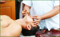 Administration of medicated oil, herbal juice or other medicated formulations to the nostrils after the proper application of medicated oil and fomentation of the face keeping the eyes protected from the heat applying during fomentation. Nasyam helps to evacuate accumulated elements in the nasal sinuses. It stimulates neuro hormonal centres, enhances the function of eyes, nose, ears, induces sound sleep and strengthens the neck and shoulder. It is very effective in the treatment of Sinusitis, Nasal congestion, Dental Problem, Ear and Eye Diseases, Facial Paralysis, Migraine and cervical degeneration.