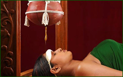 "Sirodhara" literally means continuous flow (dhara) on the head (sira). Just as the root forms the base of a plant so also in Ayurveda the head is considered the root of the body. Therefore, Sirodhara is of utmost importance in Ayurvedic treatment. Medicated oil, medicated butter milk, herbal extract etc. are allowed to flow as a continuous stream over the upper part of the forehead along with gentle massage over the scalp thus stimulating the pineal gland in the brain which produces serotonin and melatonin (hormones). These hormones play an important role in each person's emotional balance. The treatment may last for 30-45 minutes daily for a period of 07 to 21 days. It is highly effective for diseases of the nervous system and for emotional problems such as chronic depression, insomnia, loss of memory and anxiety (panic) attacks. It is also recommended for chronic headaches, as well as ear, nose and throat problems, and is especially useful for mental relaxation.
